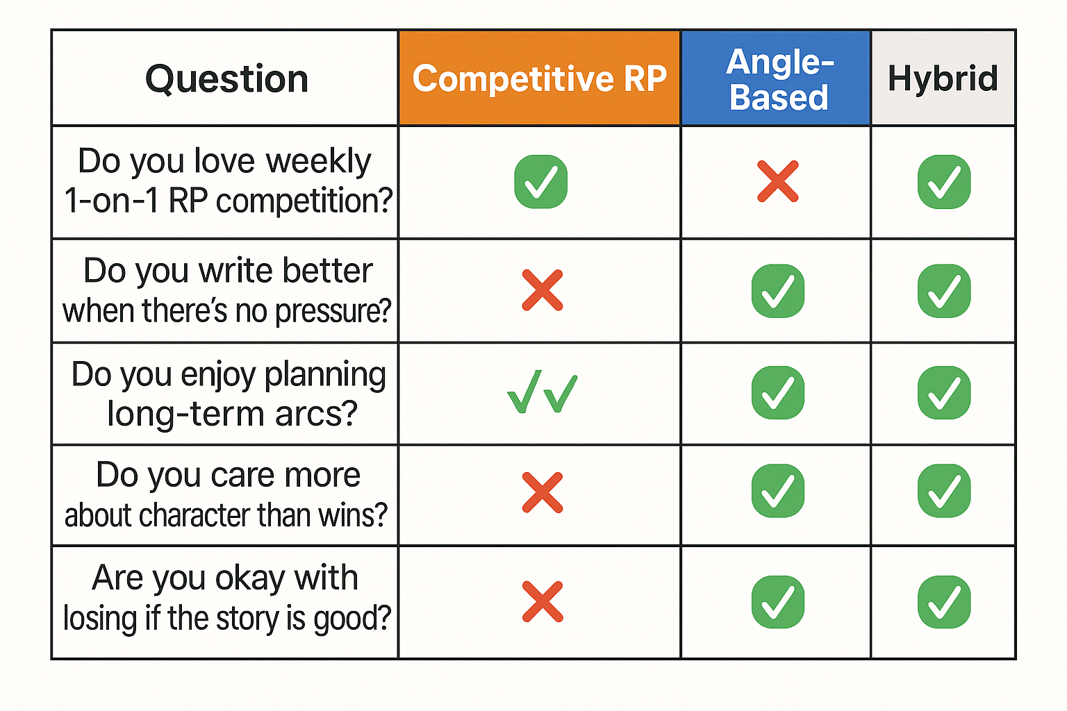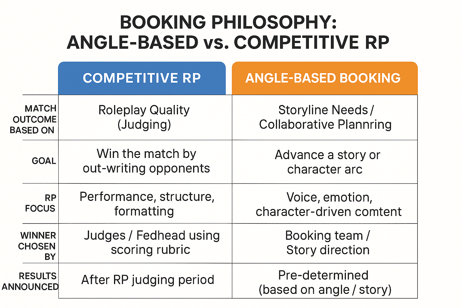 Angle-based feds focus on story first. Match outcomes are booked based on narrative needs, character arcs, and collaborative planning. RP is still encouraged (and often required), but winning isn't purely based on RP quality.