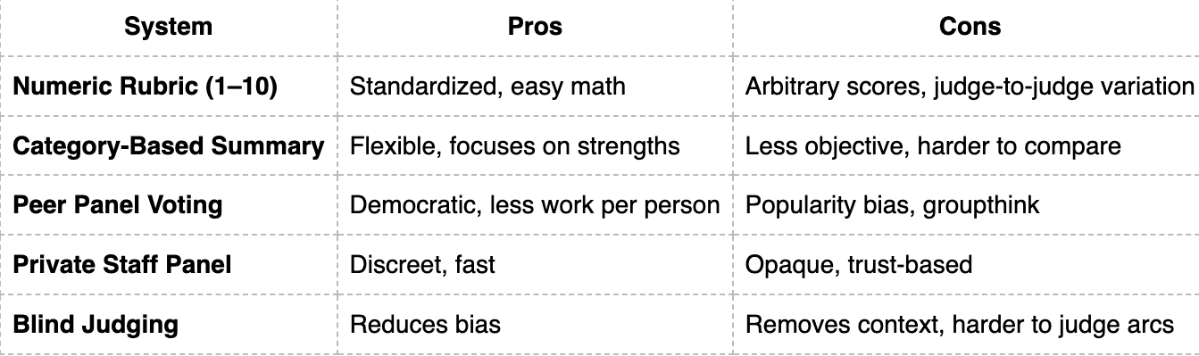 Even with a rubric, one judge’s “10/10 storytelling” is another judge’s “6/10, kinda mid.” There’s no universal standard for creative writing. And the more categories you grade, the more interpretation sneaks in.
